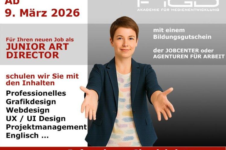 Junior Art Director – Ihre kreative Karriere startet im März 2026 Am 09. März 2026 beginnt die umfassende Vollzeit-Weiterbildung zum Junior Art Director. In einer zunehmend digitalisierten Medienlandschaft sind kreative Fachkräfte gefragt, die Gestaltung, Technik und strategisches Denken miteinander verbinden. Diese Qualifizierung bereitet Sie systematisch auf Tätigkeiten im Grafikdesign, Webdesign, UX/UI-Design und in der digitalen […]