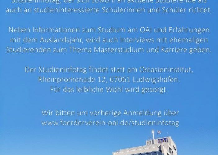 Sehr geehrte Damen und Herren, das Ostasieninstitut (OAI) der Hochschule für Wirtschaft und Gesellschaft Ludwigshafen veranstaltet am Samstag, dem 05. April, von 11 bis 15 Uhr einen Studieninfotag für alle, die Interesse am Bachelorstudiengang „International Business Management“ mit Schwerpunkt China, Japan oder Korea haben. Neben den betriebswirtschaftlichen und volkswirtschaftlichen Grundlagen umfasst das Studium eine vertiefende Auseinandersetzung mit dem Schwerpunktland (Sprache, Wirtschaft, […]