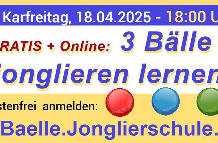 Wer schon sicher mit 3 Bällen jonglieren kann, bekommt hier GRATIS die Chance, bei Deutschlands erfolgreichstem Jongliertrainer, Stephan Ehlers, Schritt für Schritt die 4-Ball-Jonglage zu lernen! Eventdatum: Freitag, 18. April 2025 19:00 – 19:45 Eventort: Online Firmenkontakt und Herausgeber der Eventbeschreibung: FQL – Fröhlich Qualität LiefernLannerstr. 580638 MünchenTelefon: +49 (89) 171170-36Telefax: +49 (89) 171170-49http://www.FQL.de Weiterführende […]