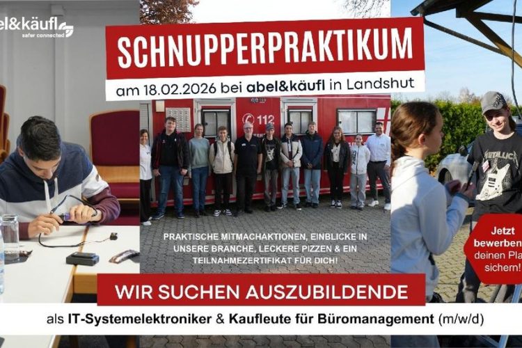 Am Mittwoch, den 18.02.2026, lädt die abel&käufl Mobilfunkhandels GmbH Schüler:innen der Klassen 8–10 zu einem eintägigen Schnupperpraktikum in unsere Zentrale nach Landshut ein. Von 09:00 bis 16:00 Uhr erhaltet die Teilnehmenden spannende Einblicke in die Ausbildungsberufe: IT-Systemelektroniker (m/w/d) Kaufleute für Büromanagement (m/w/d) Die Highlights: Eine Unternehmensvorstellung Mitmach-Stationen und praxisnahe Aufgaben Direkten Austausch mit unseren Auszubildenden Die […]