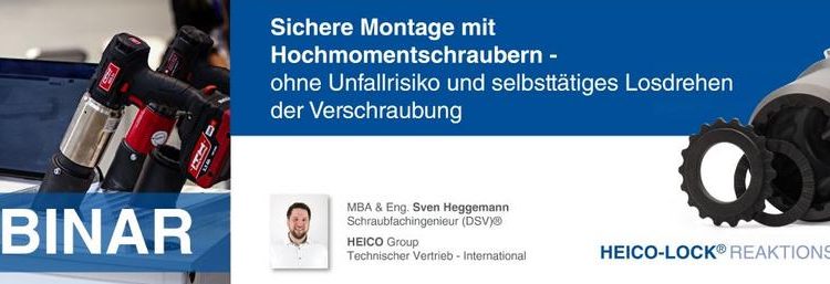 HEICO WEBINAR Wissen. Praxisnah. Für Ihren Erfolg. Sichere Montage mit Hochmomentschraubern – ohne Unfallrisiko und selbsttätiges Losdrehen der Verschraubung. HEICO-LOCK® ReaktionsscheibenGroße Schraubenverbindungen reaktionsarmfrei Anziehen und gleichzeitig gegen selbsttätiges Losdrehen sichern. Produktvorstellung HEICO-LOCK® Reaktionsscheiben Produktmerkmale Funktion Produktvorstellung HEICO-ONE Safety-Scheibe Produktmerkmale Funktion Produktvorstellung Dual-Stecknüsse Aufbau / Design Standardisierungskonzept Kooperationen mit Werkzeugherstellern Live-Demonstration FAQ / Diskussionsrunde Referent: MBA & […]