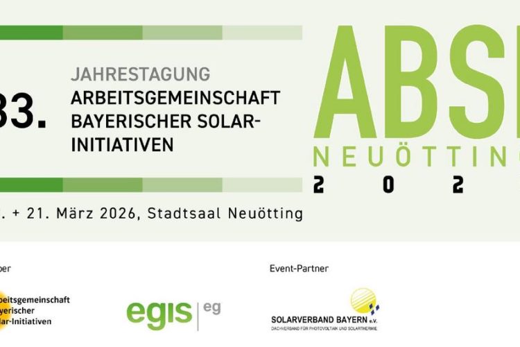 Die 33. ABSI-Jahrestagung findet am 20. und 21. März 2026 in Neuötting statt. Als Gastgeberin lädt die EGIS eG gemeinsam mit der Arbeitsgemeinschaft Bayerischer Solar-Initiativen zu zwei Tagen voller Fachvorträge, Panels und Austausch ein. Unter dem Leitmotiv „Erneuerbare – rund um die Uhr (nutzen)“ beleuchtet das Programm aktuelle Themen der Energiewende – von kommunalen Strategien über Großspeicher und Windenergie bis hin zu Innovationen […]