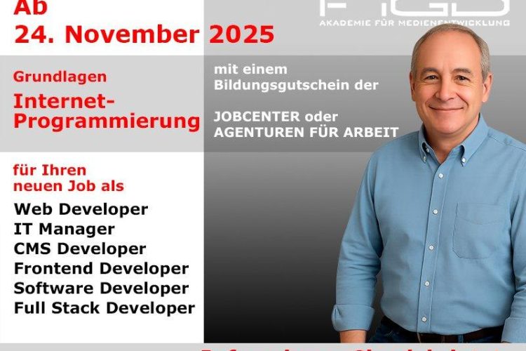 Mit dem Onlinekurs „Grundlagen Internetprogrammierung“ der FiGD Akademie erwerben Sie praxisnahe Kenntnisse für einen erfolgreichen Einstieg in die Webentwicklung – zeitgemäß, arbeitsmarktnah und bequem von zu Hause aus. Die Inhalte werden im strukturierten Live-Onlineunterricht vermittelt, inklusive direkter Betreuung durch erfahrene Fachdozenten. Der Kursstart ist am 24. November 2025. Von HTML/HTML5, CSS3 und JavaScript bis zu […]