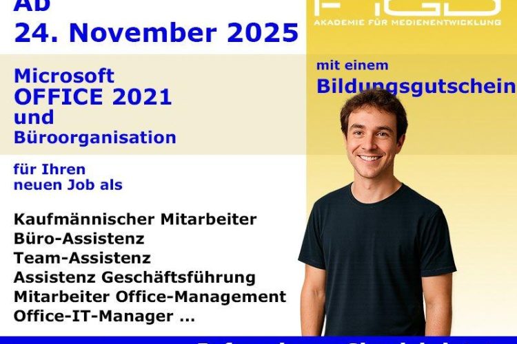 Digitales Arbeiten ist in Unternehmen längst Standard – wer Office-Tools souverän beherrscht und organisatorisch den Überblick behält, wird zur gefragten Fachkraft. Die Weiterbildung „Microsoft Office 2021 und Büroorganisation“ der FiGD Akademie bereitet Sie in einem strukturierten Onlinekurs gezielt auf Tätigkeiten im kaufmännischen und organisatorischen Bereich vor. Der Kurs ist zu 100 % förderfähig über den […]