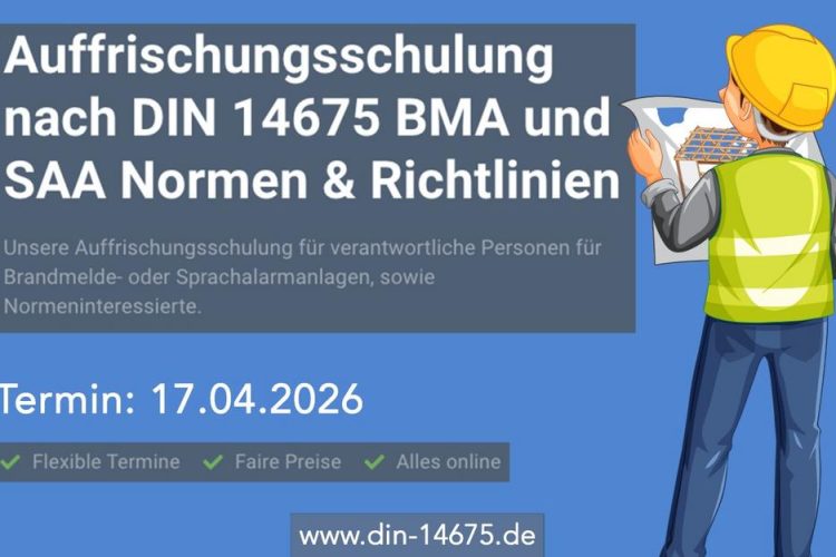 Unsere vollumfängliche Schulung zur verantwortlichen Person für Brandmeldeanlagen nach DIN 14675 Onlineschulung zur verantwortlichen Person für Brandmeldeanlagen nach DIN 14675: In jedem Unternehmen muss ein Mitarbeiter tätig sein, der die Prüfung zur verantwortlichen Person BMA nach DIN 14675 erfolgreich bestanden hat. Es ist völlig egal, bei welcher Gesellschaft Sie die Prüfung durchgeführt haben. Ab dem […]