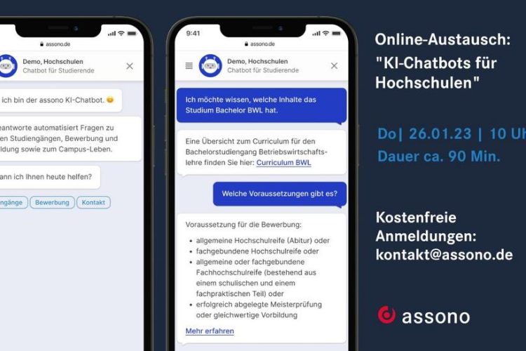 Am 26. Januar um 10 Uhr haben wir einen Online-Austausch zum Thema „Nutzen von KI-Chatbots für Hochschulen“ geplant. In dem kostenlosen Zoom-Meeting sprechen unsere Chatbot-Experten mit Ihnen über die Vorteile eines KI-Chatbots für Hochschulen, teilen Erfahrungswerte aus der Praxis und zeigen Ihnen eine Live-Demo. „Wann endet die Bewerbungsfirst? Welchen NC hat der Studiengang BWL? Wie […]