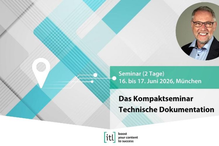 Das Kompaktseminar Technische Dokumentation16. bis 17. Juni 2026, SeminarReferent: Dieter Gust Statt bisher drei Tage nun neu zwei Tage mit den wichtigsten Themen der Technischen Kommunikation. Das 2-tägige itl-Kompaktseminar Technische Dokumentation bietet Ihnen gebündelt 40 Jahre Praxis-Know-how. Bleiben Sie up to date: Aktuell: die neuesten Trends und die wichtigen zeitlosen Themen aus der Technischen Dokumentation.Die […]