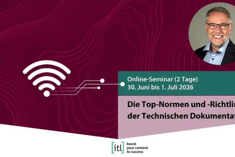 Die Top-Normen und ‑Richtlinien der Technischen Dokumentation30 Juni bis 1.Juli 2026, Online-SeminarReferent: Dieter Gust Das 2-tägige itl-Normenseminar gibt Ihnen den passenden Überblick über Normen, Richtlinien und gesetzliche Vorgabe aus dem Bereich der Technischen Dokumentation. Der itl-NormenGuide und eine umfassende Checkliste nach 82079 sind Bestandteil des Seminars. Der Grundansatz des Seminars beruht auf den Top 15 […]